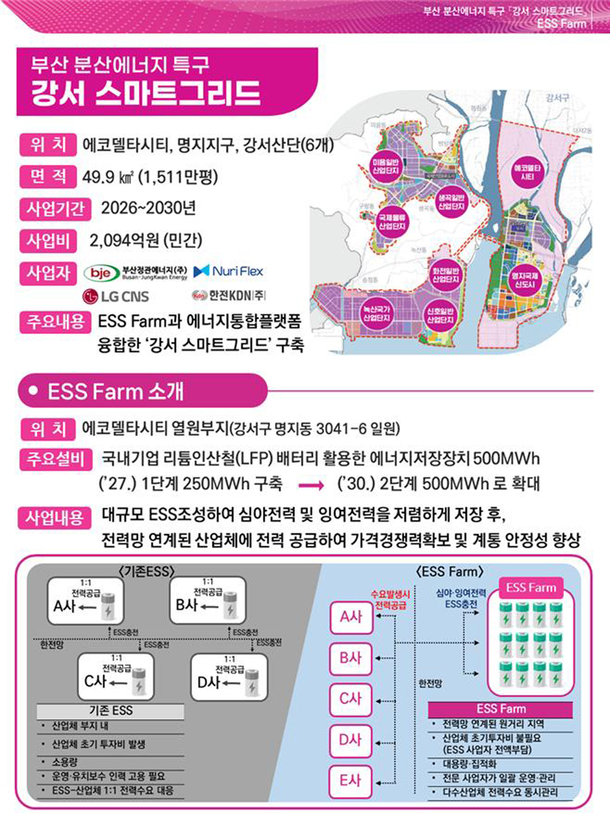 부산은 3가지 분산 특구 유형(전력수요유치형, 공급자원유치형, 신산업활성화형) 중 ‘신산업활성화형’으로 지정돼 대규모 에너지저장장치(ESS) 설치와 인공지능(AI) 기반 에너지 관리 효율화를 핵심 내용으로 추진한다.