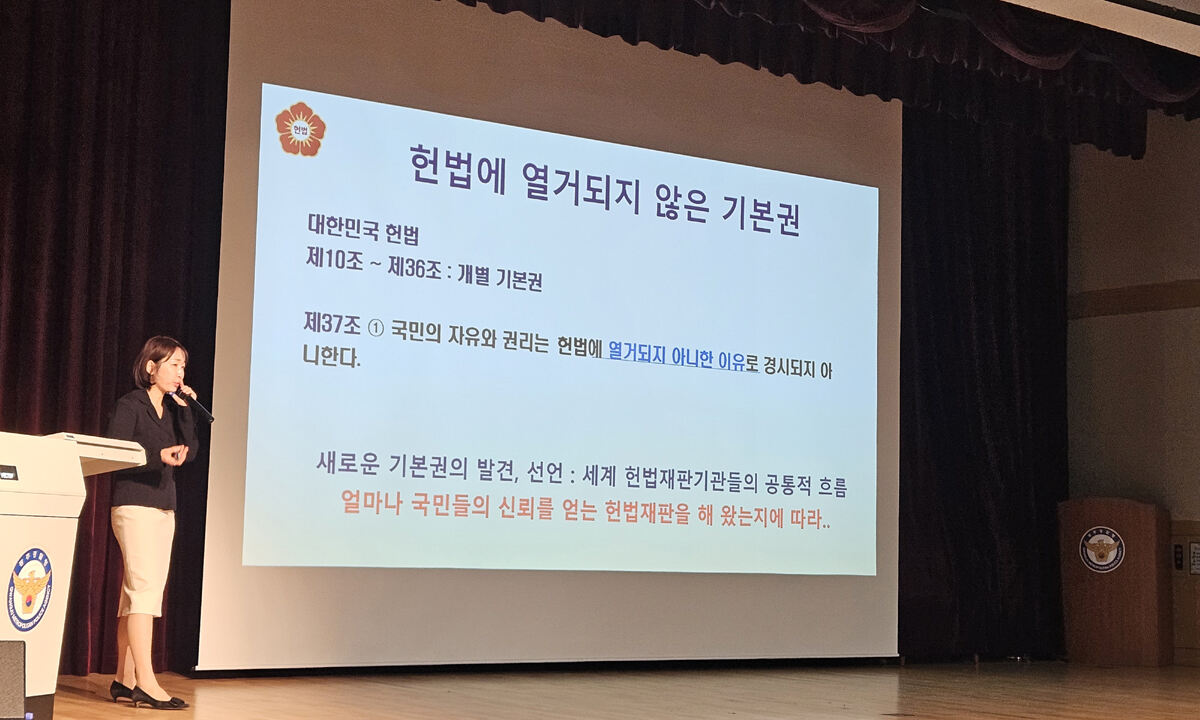강연자로 나선 박세영 헌재 선임헌법연구관(사법연수원 38기)은 “최근 일련의 사태가 발생하면서 헌법이라는 말이 여러 번 사용됐지만, 헌법의 의미에 대해서 구체적으로 짚어본 적은 없을 것 같다”며 “헌법은 공무생활을 할 때 큰 지침이자 기준점이 된다”고 강조했다. 강의는 헌법의 구성을 비롯해 헌법상 기본권과 주요 헌재 결정례에 관한 내용으로 진행됐다. 박 연구관은 “기본권은 개인이 국가에 대해 가지는 권리”라면서 “권력이 부패하면 기본권을 침해할 수 있기에 입법, 행정, 사법을 분리하는 것도 기본권 보장의 개념에서 맞닿은 부분”이라고 설명했다. 교육에 참석한 기동대 소속 경찰관은 “현장에서 법 집행을 할 때 많은 도움이 될 것 같다”고 전했다.