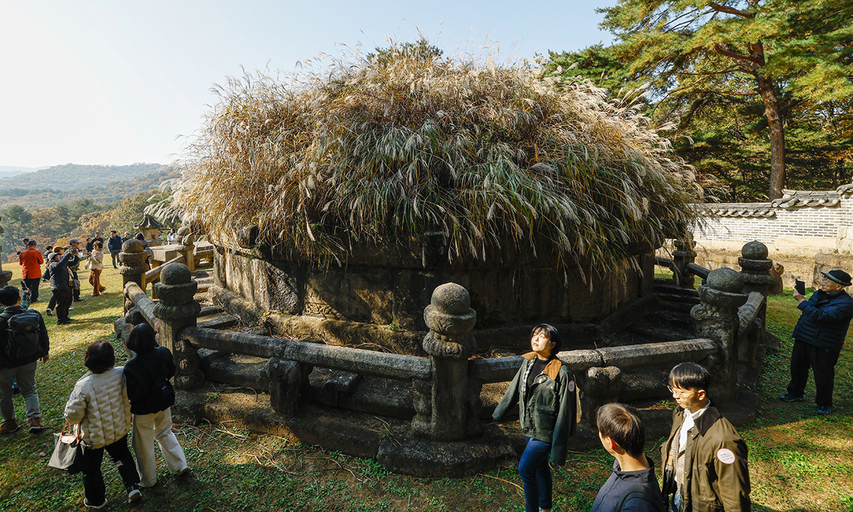 5일 경기 구리시 인창동 동구릉 건원릉에서 능침 특별 개방 행사를 찾은 시민들이 능침을 관람하고 있다. 건원릉은 조선을 건국한 태조 이성계의 능으로 조선왕릉 중 유일하게 능침(왕릉 주인이 묻혀 있는 곳) 봉분이 억새로 덮여 있다. 국가유산청 궁능유적본부 조선왕릉동부지구관리소는 이날부터 9일까지 매일 오전 10시와 오후 2시 능침을 개방한다.