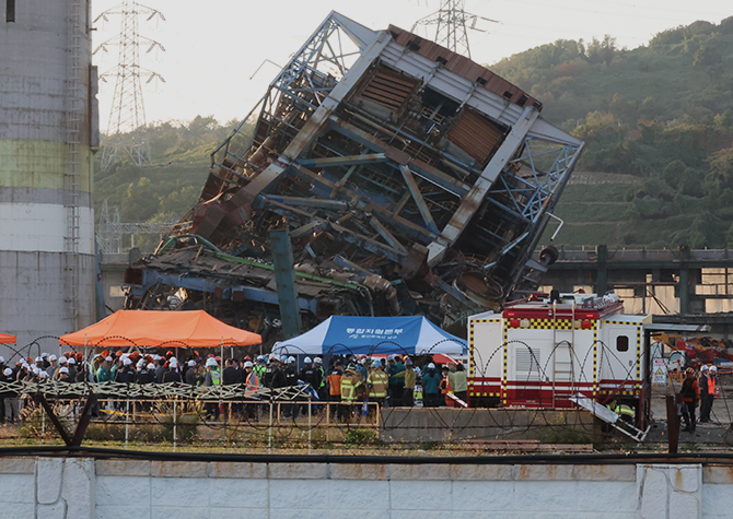 한국동서발전 울산화력발전소에서 가동이 중단된 발전시설이 붕괴돼 작업자 9명이 매몰됐다. 이날 오후 8시 기준 2명은 구조됐으며, 2명은 구조중에 있고, 나머지 5명은 매몰된 상태다.