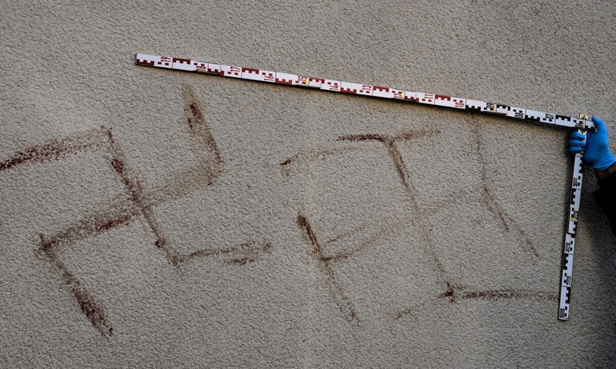 낙서의 절반 이상은 하켄크로이츠 모양이었고 분석 결과 낙서에 쓰인 액체는 인간 혈액으로 파악됐다.