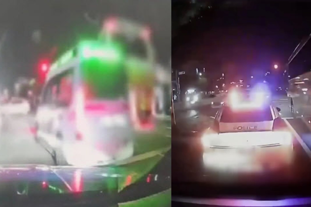 위급한 산모를 이송하던 구급차에 길을 터주지 않은 순찰차가 논란이 됐다. 지난달 30일 밤 9시쯤 부산 서구의 한 도로에서 순찰차 앞을 지나는 사설 구급차(왼쪽)와 구급차 블랙박스에 찍힌 순찰차 모습. 연합뉴스