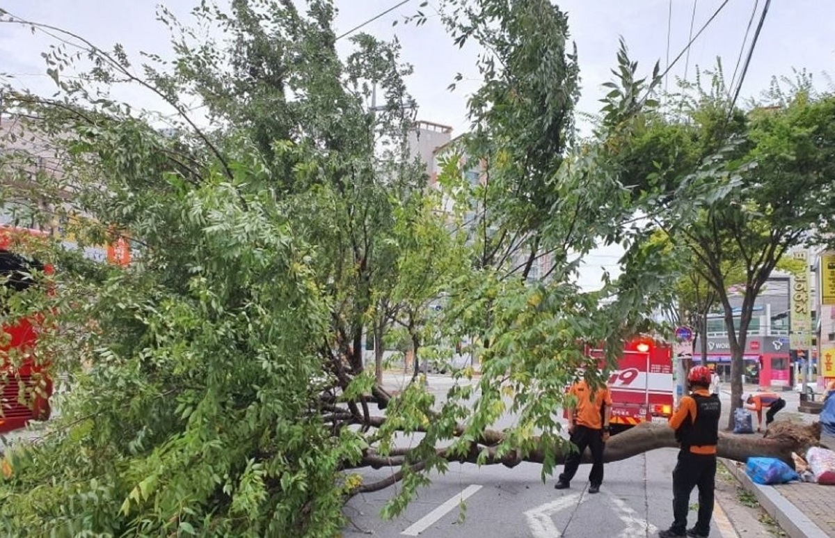 전북 군산시 미룡동의 한 도로에 가로수가 쓰러진 모습. 기사 이해를 돕기 위한 자료사진. 군산=연합뉴스