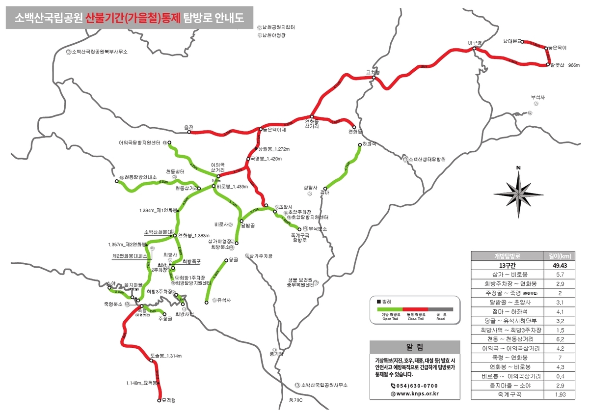 통제 탐방로는 초암사~국망봉과 국망봉~늦은목이, 묘적령~죽령 탐방로 등 7개 구간이다. 상세 내용은 국립공원공단 홈페이지에서 확인할 수 있다. 통제 구간을 제외한 정규 탐방로는 평상시와 같이 출입이 가능하다.