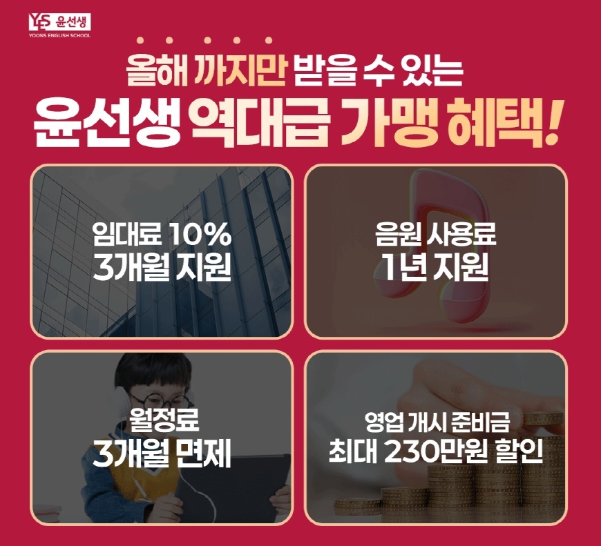 임대료 지원 등 혜택이 눈에 띈다. 영어교육 전문기업 윤선생은 신규 사업자에게 학원 및 교습소 월세의 10%를 3개월간 월 20만원까지 지원하는 사업자 모집 프로모션에 돌입했다. 직접적으로 임대료를 지원하는 것은 가맹 사업을 시작한 이래 최초다. 윤선생 학사시스템 이용료 등의 월정료도 3개월간 전액 면제되며, 음원사용료 관련 혜택도 주어진다. 브랜드 사용료 등 본사에 납부하는 영업개시준비금은 최대 230만원까지 할인한다. 자세한 내용은 오는 27일 온·오프라인 사업자 설명회에서 들을 수 있다. 참가 희망자는 윤스닷컴 홈페이지에서 온라인으로 신청하면 된다.