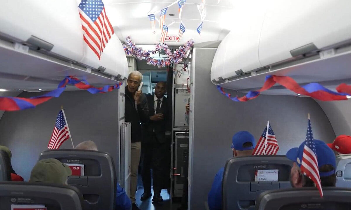 재향군인의 날인 11일(현지시간) 오바마 전 대통령은 자신이 한국전쟁과 베트남전쟁 등에 참전한 퇴역군인들과 그 가족이 탄 여객기에서 기내 마이크를 잡고 인사말을 하는 영상을 엑스(X·옛 트위터)에 올렸다.