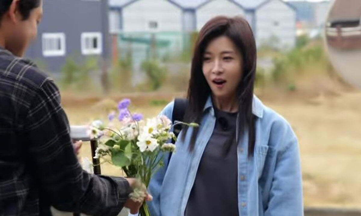 하지원이 촬영 현장에 도착하자 김대호는 꽃다발을 깜짝 선물했다.