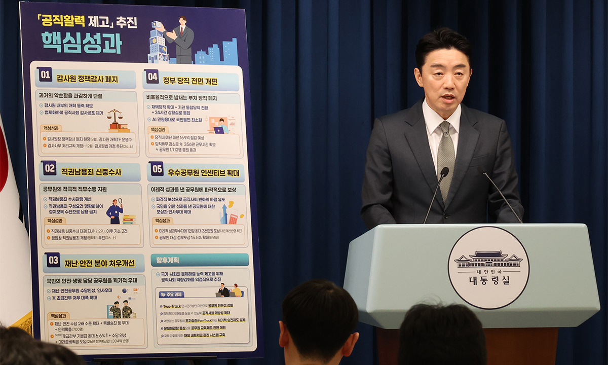 대통령실은 감사원의 정책감사 폐지를 제도화해 공무원들이 소신껏 일할 수 있는 환경도 만들겠다고 강조했다. 강 실장은 “내년 상반기에는 감사원법을 개정해 정책감사 폐지를 제도화하겠다”고 말했다. 정책감사는 지난 8월부터 중단된 상황이다. 또 내년 4월부터 중앙부처 당직실을 전면 폐지하고 재택당직을 전면적으로 확대하는 안과 재난·안전 분야 공무원 및 군 초급간부 처우 개선, 특별 성과 공무원 포상금 제도 신설 등 공직사회가 반기는 내용이 발표에 포함됐다.