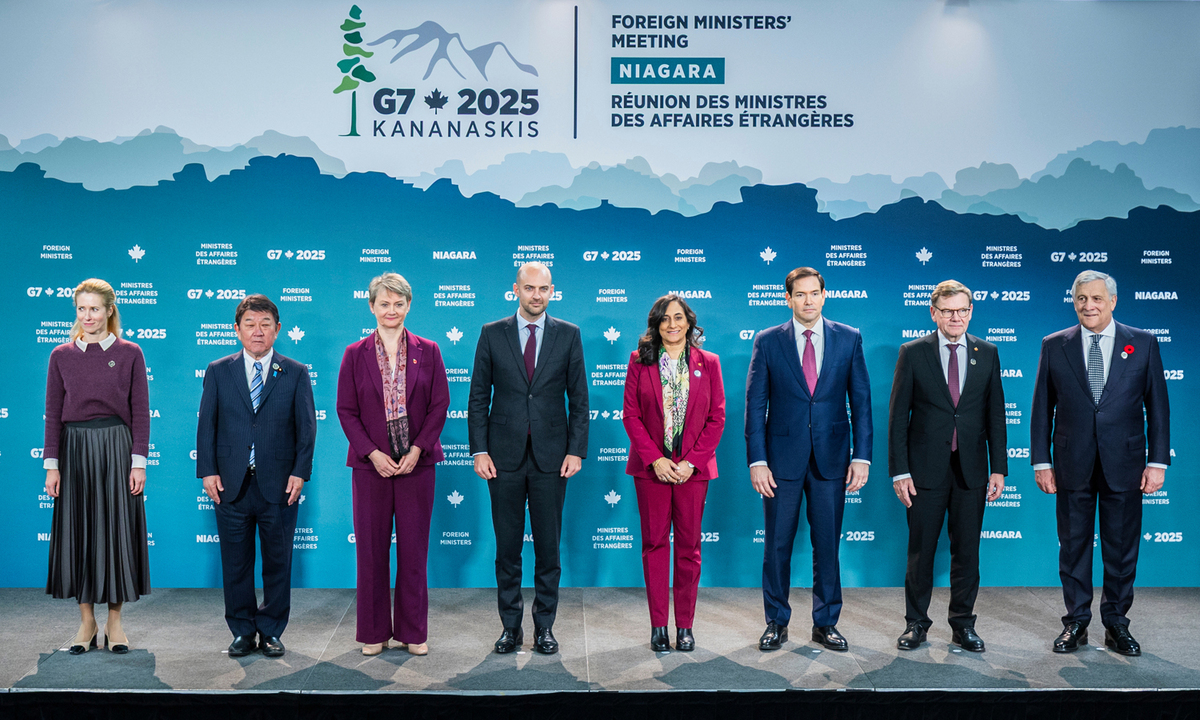11일(현지 시간) 캐나다 온타리오주 나이아가라온더레이크에서 열린 주요 7개국(G7) 외교장관 회의에 참석한 각국 외교장관들이 기념촬영을 하고 있다. 왼쪽부터 카야 칼라스 유럽연합(EU) 외교·안보정책 고위대표, 모테기 도시미쓰 일본 외무상, 이베트 쿠퍼 영국 외무장관, 장 노엘 바로 프랑스 외무장관, 아니타 아난드 캐나다 외무장관, 마코 루비오 미 국무장관, 요한 바데풀 독일 외무장관, 안토니오 타야니 이탈리아 외무장관. AP통신 제공