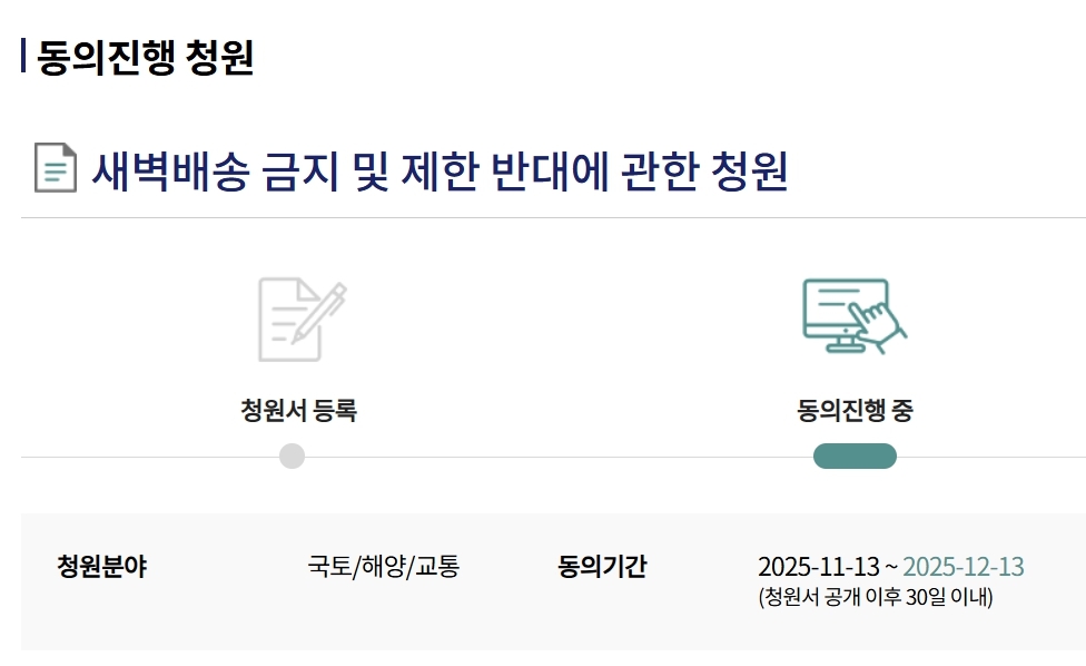 노동계와 유통업계의 쟁점이 되는 ‘새벽배송 금지’를 막아달라는 어느 ‘워킹맘’의 호소글이 국회 국민동의청원 페이지에 올라왔다.