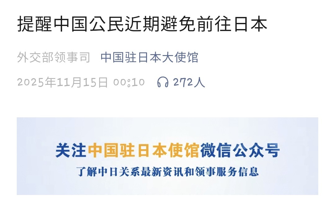 대사관 측은 “중국인들의 일본 여행 자제를 엄숙히 당부한다”며 “일본에 체류 중인 이들은 현지의 치안 상황을 면밀히 주시하고 안전 예방 조치에 대한 경각심을 높여야 한다”고 덧붙였다. 그러면서 “긴급 상황 발생 시 즉시 경찰에 신고하고 주일중국대사관이나 영사관에 도움을 요청하라”면서 오사카와 후쿠오카 등 일본 내 주요 지역에 있는 영사관의 연락처를 함께 공개했다.