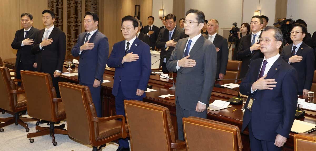 이 대통령은 용산 대통령실에서 회의를 주재하고 관세협상 과정에서 정부와 함께 공동 대응한 기업인들에게 감사의 뜻을 표했다. 이 대통령은 “한·미 통상·안보 협상 과정에서 많은 분이 애쓰셨지만 가장 애를 많이 쓰신 것은 역시 여기 계신 분들을 포함한 기업인들”이라며 “지금까지 정부와 기업이 이렇게 합이 잘 맞아서 공동 대응을 한 사례가 없었던 것 같다, 그것은 전적으로 우리 기업인 여러분들 정말 헌신과 노력 덕분”이라고 말했다.