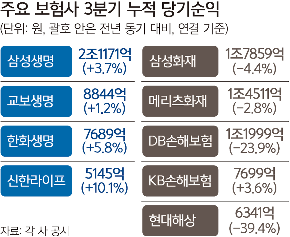 생명보험사는 삼성생명 ‘1강 구도’가 여전한 가운데 한화생명과 신한라이프 간 3위 싸움이 치열하다. 삼성생명은 3분기 누적 순이익(연결 기준) 2조1171원을 기록하며 전년 동기 대비 3.7% 증가했다. 2위는 교보생명(8844억원), 3·4위는 한화생명(7689억원)과 신한라이프(5145억원)가 차지했다.