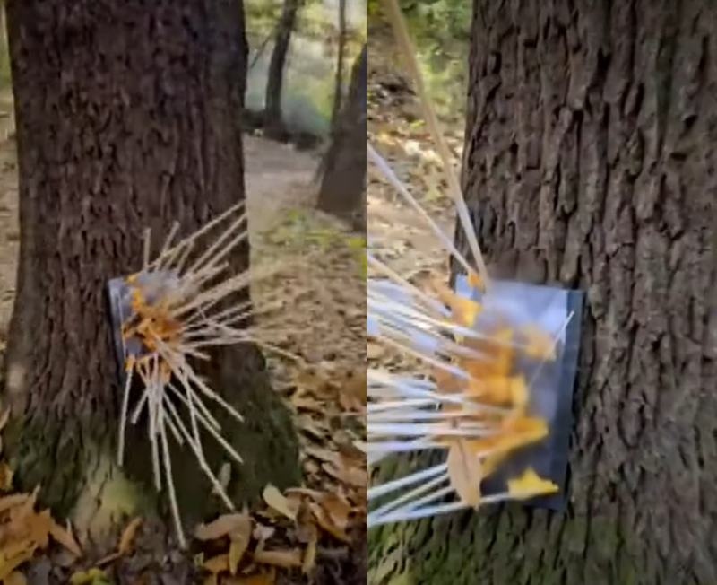 서울 송파구의 한 공원 산책로에 수십 개의 화살이 꽂혀 있는 나무 한 그루가 발견돼 인근 주민들이 불안에 떨고 있다.