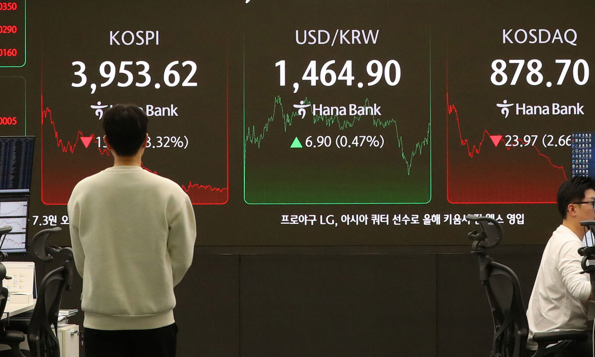 18일 한국거래소에 따르면 코스피는 이날 전장보다 135.63포인트(3.32%) 하락한 3953.62로 마감했다. 지수는 44.78포인트(1.10%) 내린 4044.47로 출발해 4072.41까지 반등했지만 이후 낙폭을 확대했다. 지난달 27일 처음으로 ‘사천피’를 달성한 이후 종가 기준 4000선 밑으로 떨어진 것은 이달 7일에 이어 두번째다. 이날 코스닥도 전장보다 23.97포인트(2.66%) 빠진 878.70에 장을 마쳤다.