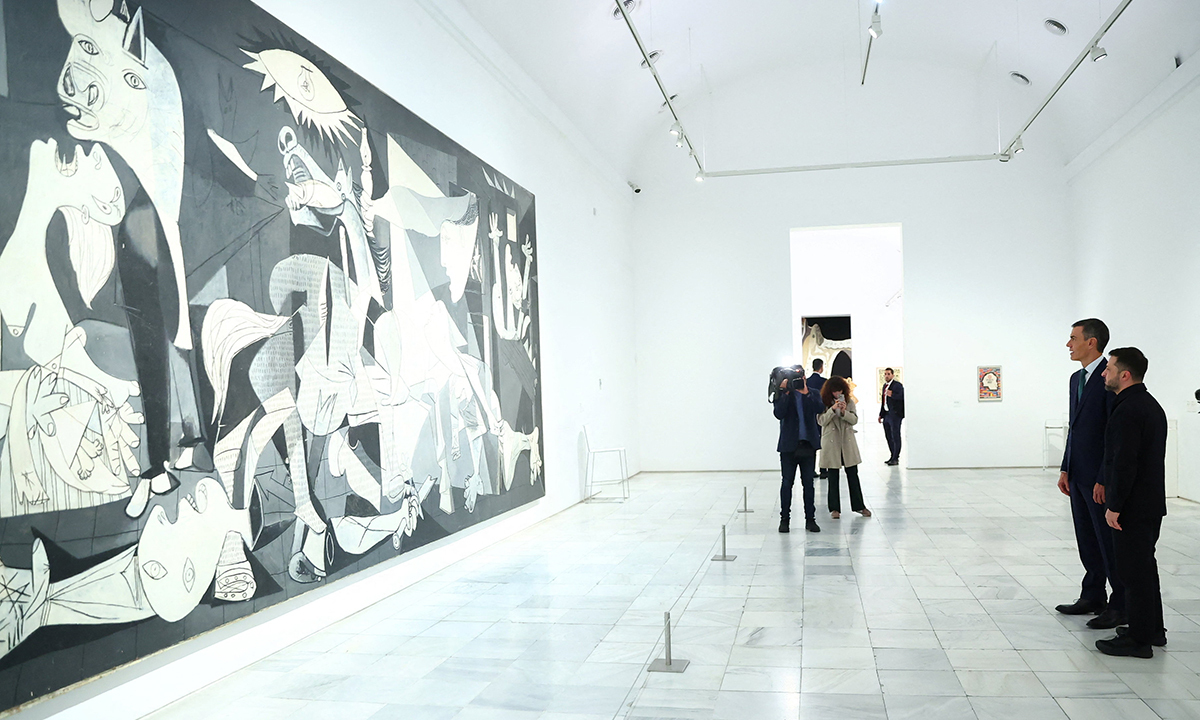 18일(현지시간) AP 통신에 따르면 젤렌스키는 이날 페드로 산체스 스페인 총리의 안내로 레이나 소피아 미술관을 찾아 그곳에 소장된 ‘게르니카’를 관람했다. 이는 세로 약 3.5m, 가로 7.8m의 거대한 캔버스 위에 그려진 유화다. 흑백의 그림에는 비명을 지르는 여성, 통증을 호소하는 가축 등이 등장해 전쟁의 참상을 고발한다. 피카소는 스페인 내전이 한창이던 1937년 4월 내전에 개입한 독일 공군이 게르니카를 표적으로 실시한 무차별 공습으로 수많은 민간인이 목숨을 잃은 사건에 격분해 이 작품을 구상한 것으로 알려져 있다.