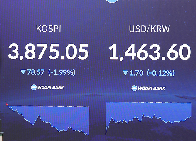 이날 오전 9시 19분 현재 코스피는 전장보다 63.49포인트(1.61%) 내린 3,890.13을 나타내고 있다.