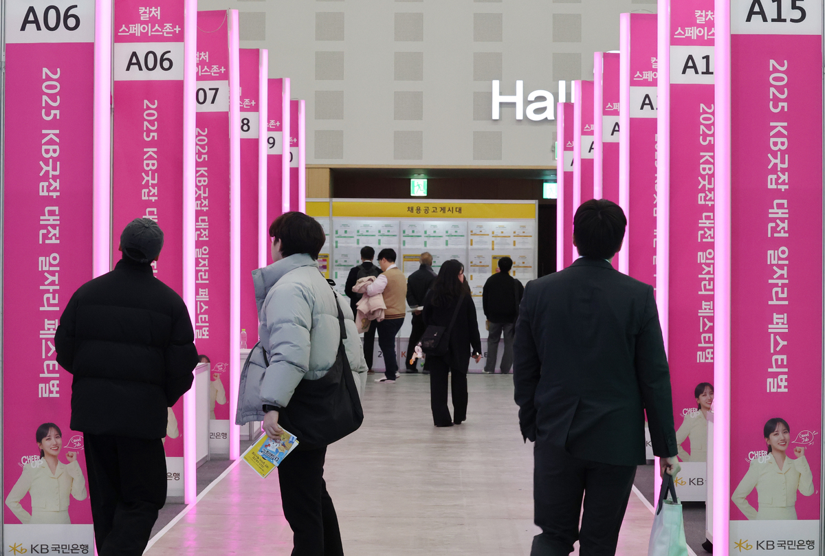 19일 대전컨벤션센터에서 열린 ‘2025 KB굿잡 대전 일자리 페스티벌’에서 구직자들이 구인기업 부스를 살펴보고 있다. 고용노동부·KB국민은행·대전시가 공동 주최하는 이 행사는 올해 28회째로, 지금까지 구직자 4만4000여명에게 새 일자리를 연결했다. 참가 기업이 정규직원 채용 시 최대 1000만원의 채용지원금, 우수 중소기업에는 대출 금리우대가 제공된다.