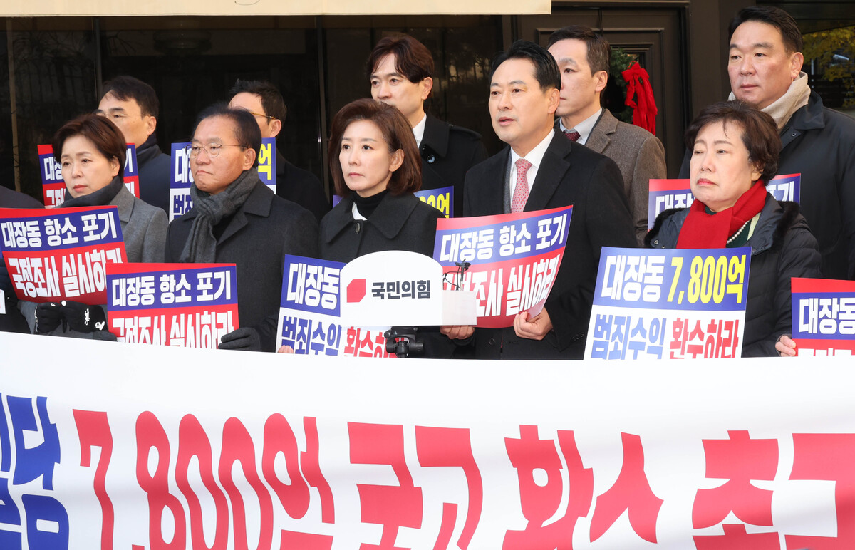 국민의힘 장동혁 대표 등 당 지도부·의원들이 19일 ‘대장동 개발사업 특혜 의혹 사건’에서 실형을 선고받은 남욱 변호사가 추징보전 해제를 요구한 서울 강남 청담동의 한 건물 앞에서 검찰의 대장동 사건 항소 포기 결정 규탄 및 범죄수익금의 국고 환수를 촉구하는 기자회견을 하고 있다. 사진 앞줄 왼쪽부터 양향자 최고위원, 윤재옥 의원, 나경원 의원, 장 대표.