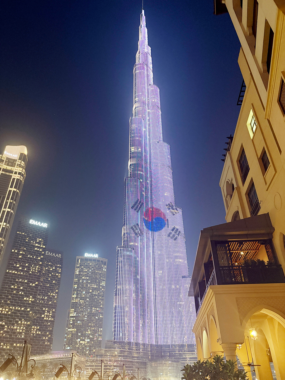 아랍에미리트(UAE) 두바이의 초고층 빌딩 ‘부르즈 할리파’ 외벽에 18일(현지시간) 이재명 대통령의 국빈 방문을 환영하는 태극기 조명이 점등돼 있다. 대통령실은 “UAE 측은 전날에도 수도 아부다비 시내 주요 랜드마크 건물, 아부다비석유공사(ADNOC) 본사 외벽 등에 태극기 조명을 점등하며 한국에 대한 환영의 뜻을 표했다”고 밝혔다.