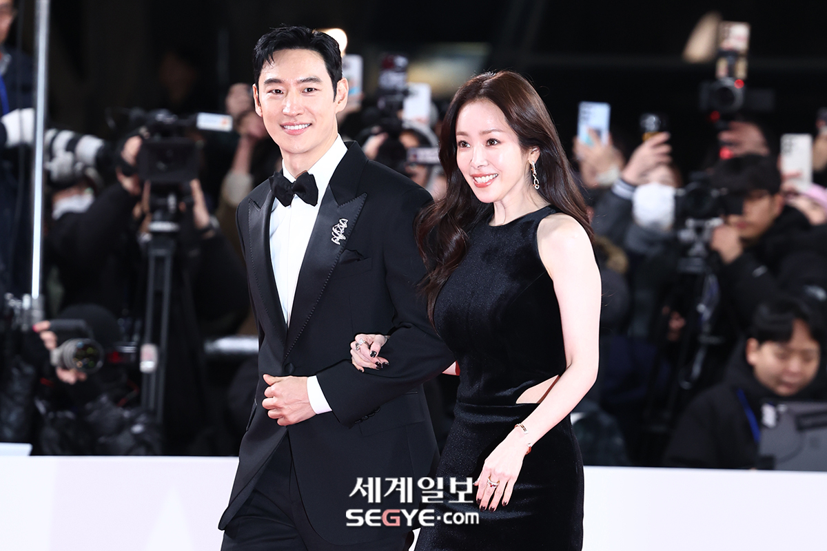 배우 이제훈(사진 왼쪽)과 한지민이 19일 서울 여의도 KBS홀에서 열린 ’제46회 청룡영화상’ 시상식 레드카펫 행사에 참석해 포즈를 취하고 있다.