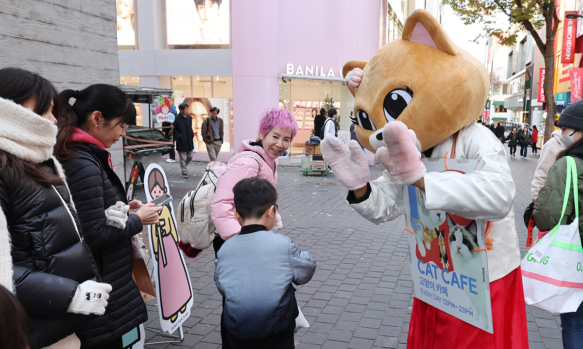 강추위가 찾아온 명동거리에서 고양이 인형탈에 한복을 곱게 차려입은 고양이 카페 아르바이트 직원이 외국인 관광객들에게 손을 흔들며 반갑게 인사하고 있다. 귀여운 고양이 모습에 관광객들도 기념사진을 찍으며 즐거워한다. 최근 우리나라를 찾는 외국인 관광객의 증가로 서울 최대 관광지 명동 거리도 활기를 되찾고 있다. 우리나라를 방문한 관광객에게 좋은 인상과 편안함을 심어주는 고양이 인형탈 청년이야말로 명동의 관광 역군이라 할 수 있다. 경기 침체는 계속되고 있지만 다가오는 연말에는 명동 자영업자들의 얼굴에 미소가 번지길 바란다.