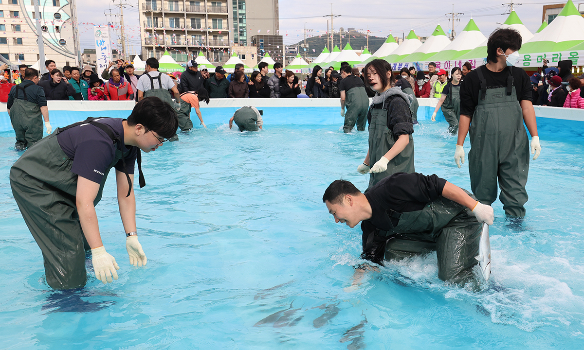 20일 제주 서귀포시 대정읍 모슬포항에서 열린 ‘최남단 방어축제’에서 참가자들이 맨손으로 방어를 잡고 있다.