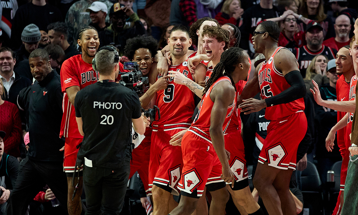 미국 프로농구(NBA) 시카고 불스 선수들이 20일(한국시간) 미국 오리건주 포틀랜드의 모다 센터에서 열린 2025∼2026 정규리그 포틀랜드 트레일 블레이저스와의 원정 경기에서 경기 종료 1초 전 터진 니콜라 부세비치(9번)의 극적인 3점슛에 힘입어 122-121 역전승을 거둔 뒤 기뻐하고 있다.