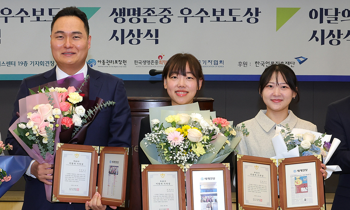 20일 서울 중구 한국프레스센터에서 열린 제422회 이달의기자상 시상식에서 ‘매니페스토, 내일을 바꾸는 약속’ 보도로 기획보도 신문·통신 부문상을 수상한 세계일보 탐사보도팀 조병욱(왼쪽부터)·정세진 기자, 외교안보부 장민주 기자가 기념 촬영을 하고 있다.