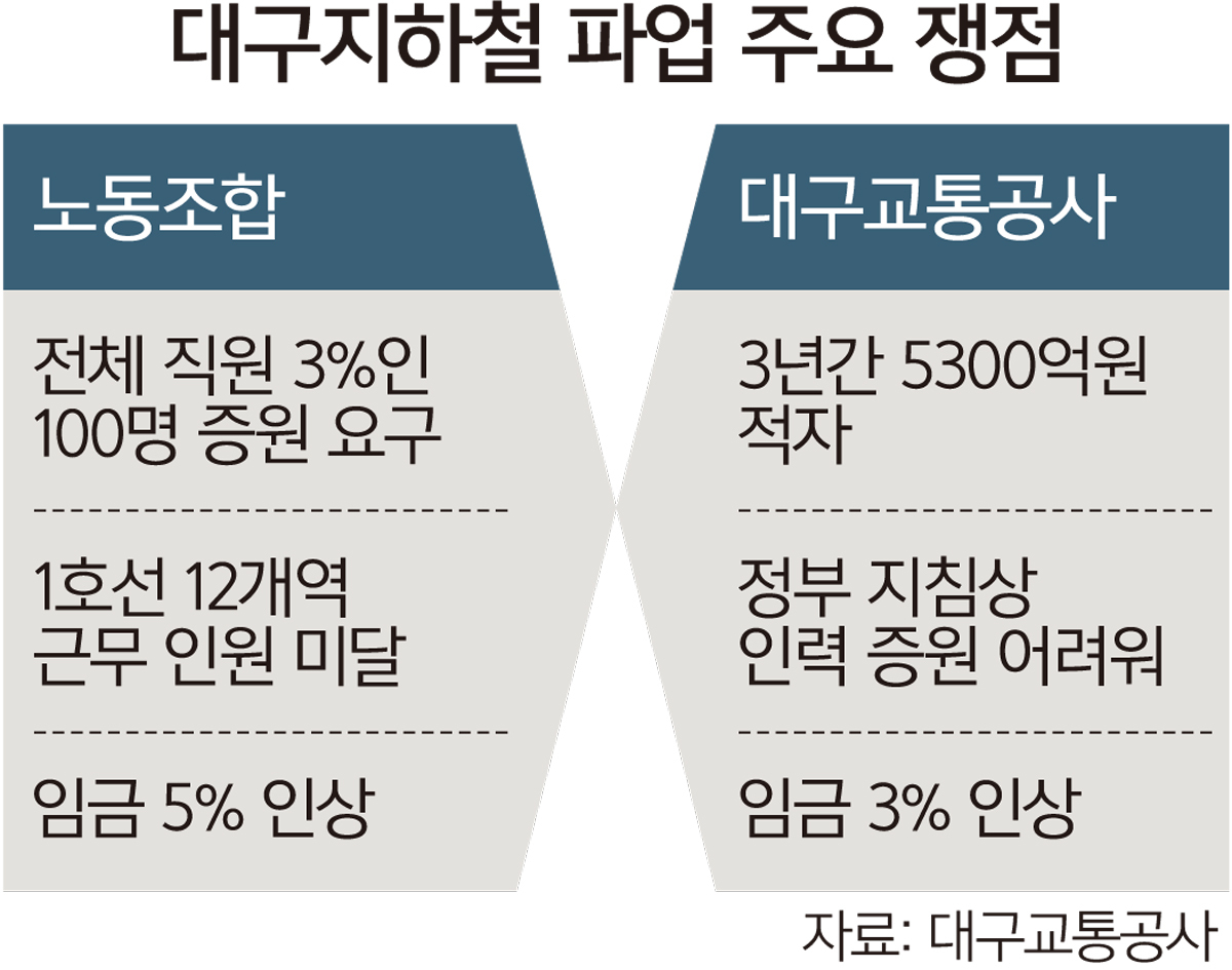 반면, 사측은 최근 3년간 도시철도 누적 적자만 5300억원에 달하고, 정원 확대는 대구시 승인 사항이라 용역을 통해 정확한 증원 규모부터 파악하자는 입장을 고수하고 있어 문제해결이 쉽지 않을 것으로 보인다. 공사 관계자는 “위법부당 파업행위에 대해서는 엄중 대응해 나갈 방침”이라고 밝혔다.