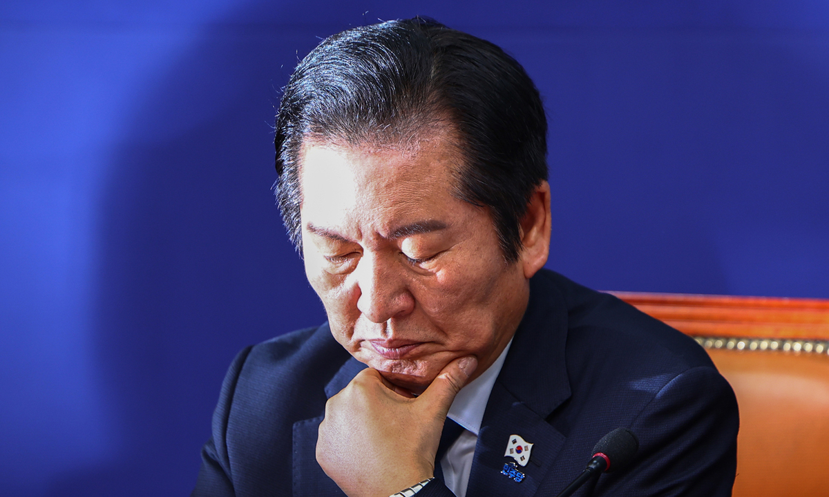 정청래 더불어민주당 대표가 24일 서울 여의도 국회에서 열린 민주당 국방안보특별위원회 출범식 및 제1차 회의에서 생각에 잠겨 있다.