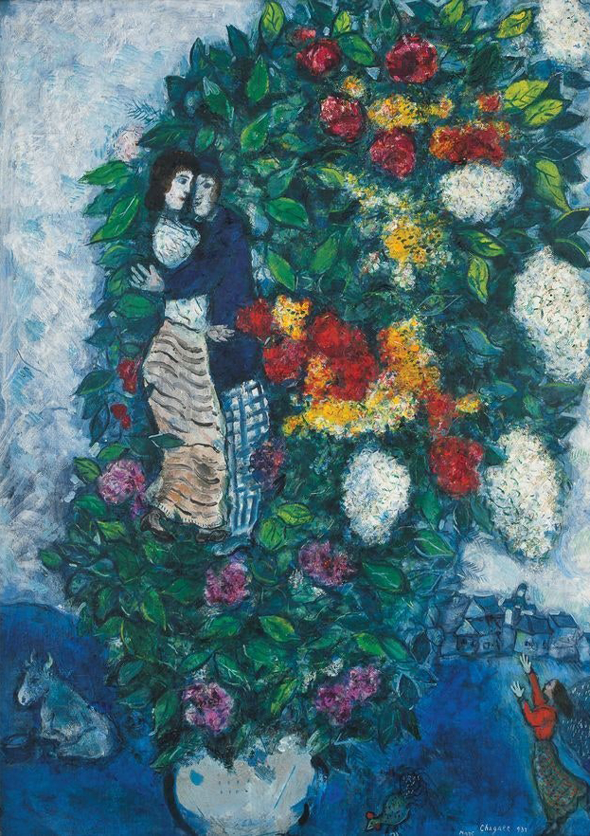 서울옥션은 24일 서울 강남 본사에서 진행한 이브닝 세일에서 샤갈의 1937년작 ‘꽃다발’이 시작가 94억원에 낙찰됐다고 밝혔다. 연인 벨라와 프랑스 파리에 머물던 전성기에 완성한 작품으로, 특유의 푸른 색조와 공중에서 포옹하는 연인, 화면을 가득 채운 꽃다발 모티프가 돋보이는 작품이다.