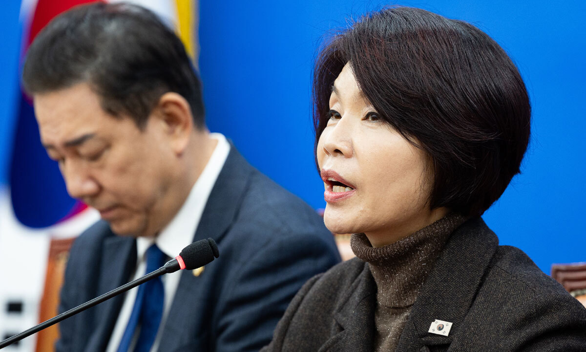 한정애 더불어민주당 정책위의장이 25일 서울 여의도 국회에서 열린 원내대책회의에서 모두 발언을 하고 있다. 뉴스1