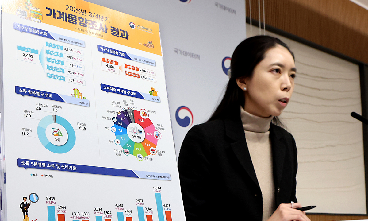 국가데이터처가 27일 발표한 ‘2025년 3분기 가계동향조사 결과’에 따르면 올해 3분기 가구당 월평균 소득은 543만9000원으로 전년 동분기보다 3.5% 늘었다. 물가 상승 영향을 제거한 실질소득은 1.5% 증가했다. 실질소득은 3분기 연속 2%대 증가율을 보이다가 올해 2분기 제자리걸음한 뒤 ‘플러스’로 반등했다.