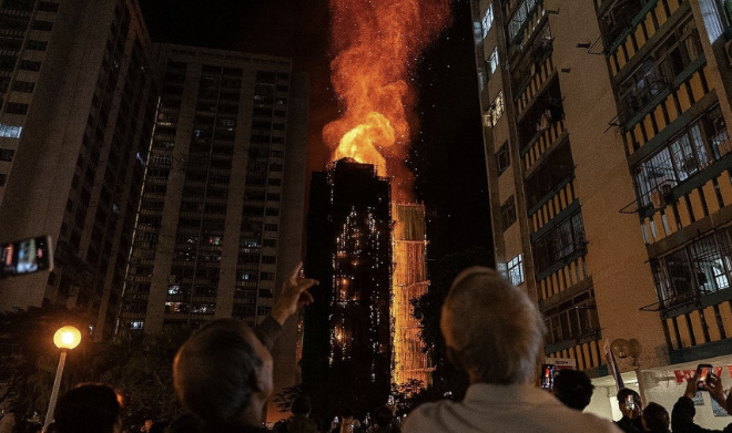 화재 당시 건물은 1년 넘게 대규모 보수 공사 중이었던 것으로 알려졌다. 외벽에 설치된 대나무 비계와 공사용 안전망으로 불이 번지면서 대형 불기둥이 치솟았다.