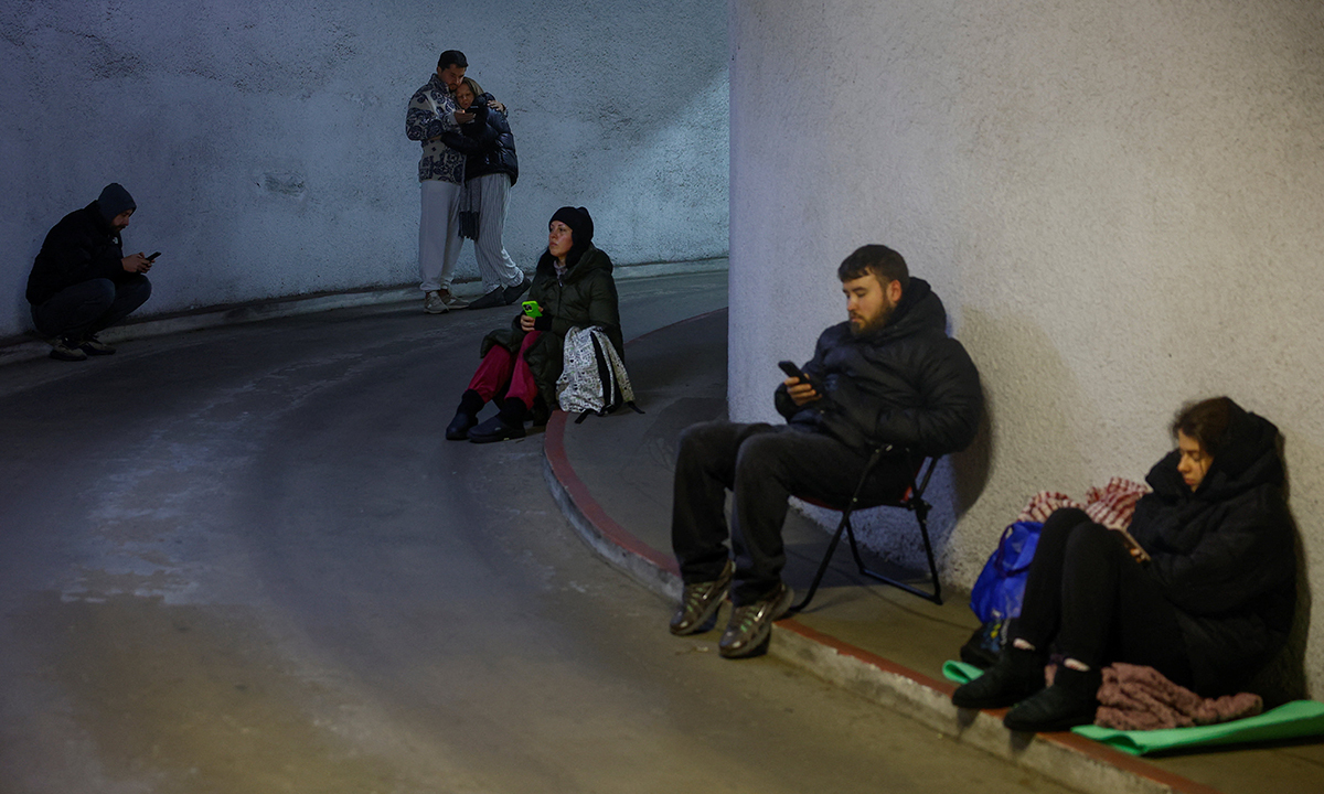 러시아의 대규모 공습이 한창인 25일(현지시간) 우크라이나 수도 키이우에서 시민들이 미사일과 드론 공격을 피하기 위해 지하 주차장에 피신해있다.