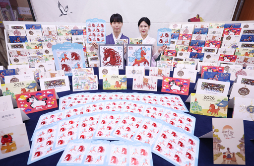 27일 서울 중구 서울중앙우체국에서 직원들이 2026년 연하 우표와 카드 등을 소개하고 있다. 우정사업본부는 2026년 병오년(丙午年) 붉은 말의 해를 맞아 말을 주제로 한 연하우표 60만장과 연하카드·엽서 12종을 다음달 1일 출시한다고 밝혔다.