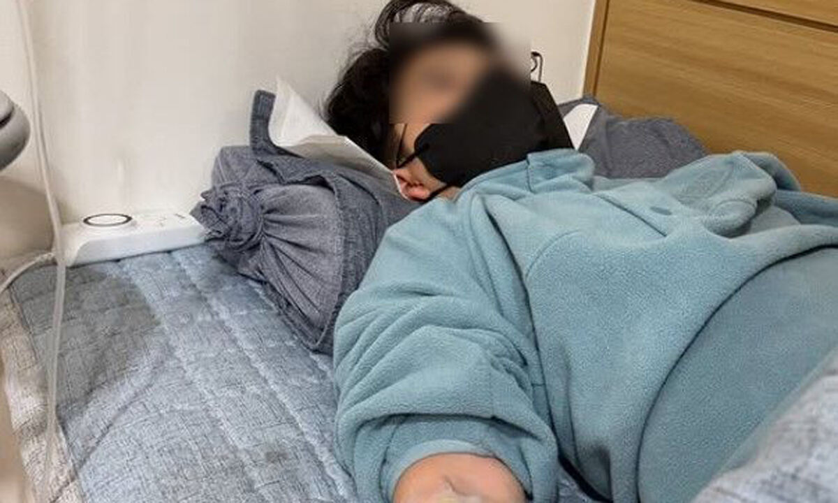 마스크를 쓴 채 팔에 주사 바늘을 꽂고 누워 있는 모습이 보는 이들의 안타까움을 자아냈다.