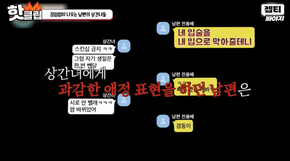 휴대전화에는 ‘네 입술을 내 입술로 막아주겠다’, ‘겸둥이’ 등 애정표현이 난무했다. 게다가 ‘자기랑 이런 사이인 거 와이프한테 말해도 돼?’라며 불륜에 당당한 태도를 보였다. 상대 여성은 오픈채팅으로 알게 된 3살 연하 유부녀였다. 10명이 참석한 단체 모임에서 3번 만나고 단둘이는 2~3번 만난 사이다.