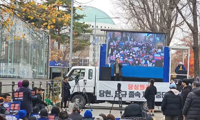 300여명(주최 측 추산)의 당원들은 이날 서울 영등포구 국회 앞에서 집회를 열고 대의원과 권리당원의 표 가치를 1인 1표로 동등하게 하는 당헌·당규 개정이 졸속으로 추진되고 있으며 당심'(黨心)을 왜곡할 수 있다고 주장했다.