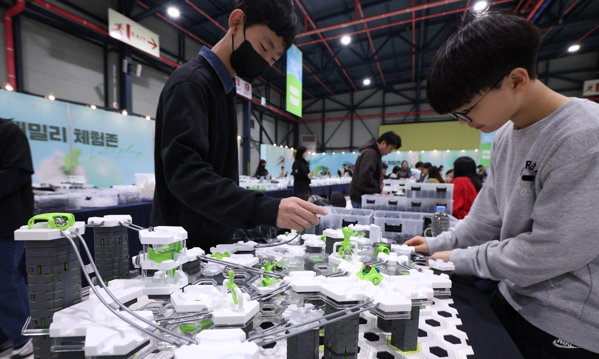 30일 서울 강남구 SETEC(세텍)에서 열린 그래비트랙스 페스타를 찾은 시민들이 그래비트랙스를 만들고 있다. 그래비트랙스는 구슬의 이동경로를 설계·조립하는 과학 실험형 완구다. 그래비트랙스 페스타에는 대형트랙, 미션 챌린지, 보드게임 체험, 스피드 규빙 등 다양한 체험과 부대 행사가 함께 마련됐다.