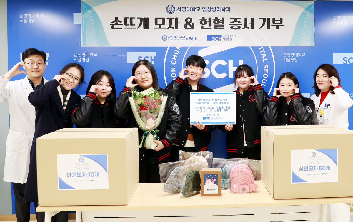 서영대학교 임상병리학과 뜨개질 동아리 ‘마인크래프트’ 회원들이 지난달 28일 서울 용산구 한남동 순천향대학교 서울병원에서 입원 중인 환우에게 직접 만든 털 모자 성인용 50개와 어린이용 10개, 헌혈증서 100장을 기증하며 따뜻한 나눔을 실천했다. 동아리 학생들은 학기 중 틈틈이 시간을 내 알록달록한 털실로 모자를 정성껏 만들어 이날 기부 행사를 가졌다. 이번 기증은 겨울철, 환우들의 보온을 돕고 힘든 투병 생활 속 작은 위로와 희망을 전하기 위해 마련됐다.