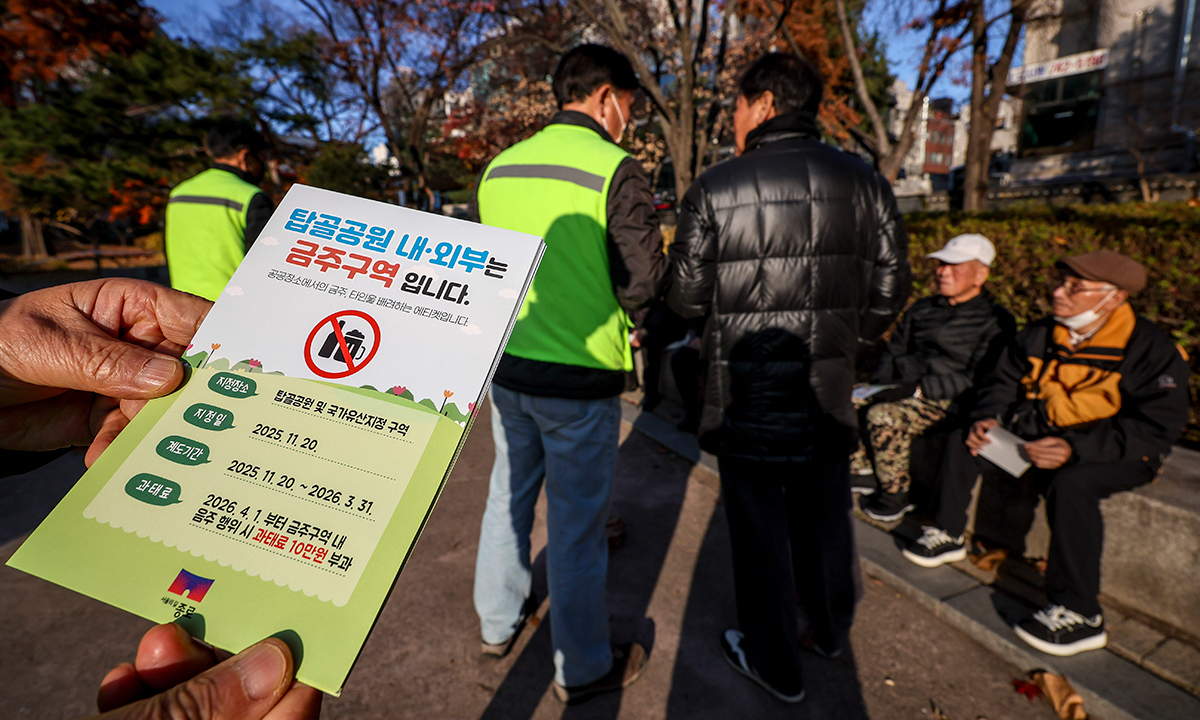 1일 서울 종로구 탑골공원에서 종로구청 관계자들이 금주구역 지정을 알리는 계도활동을 하고 있다. 종로구는 금주구역 지정 등 원각사지 십층석탑 보호각 개선을 골자로 한 ‘탑골공원 개선 사업’을 추진한다. 계도기간은 이날부터 내년 3월31일까지다. 계도기간이 끝나는 내년 4월1일부터는 탑골공원에서 술을 마시면 10만원의 과태료가 부과된다.