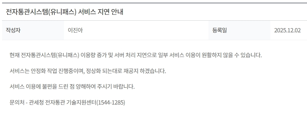쿠팡 고객 개인정보 유출에 따른 ‘개인통관번호(개인통관고유부호)’ 변경 등 이유에서인지 관세청의 ‘유니패스(전자통관시스템)’ 홈페이지가 원활하게 운영되지 않고 있다.