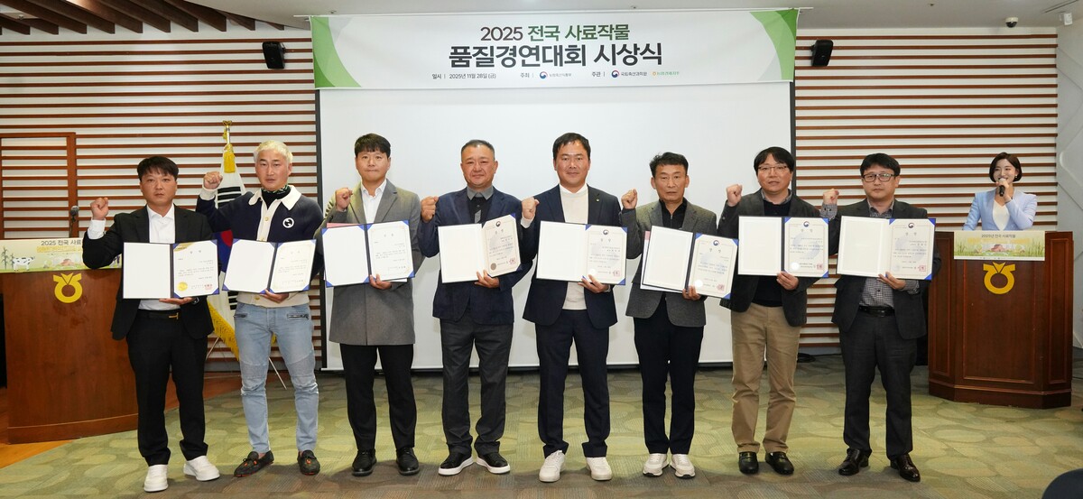 농협경제지주(축산경제대표이사 안병우)가 11월 28일, 안성팜랜드에서 농림축산식품부, 국립축산과학원, 초지조사료학회, 한국조사료협회, 조사료 경영체 등 관계자 50여명이 참석한 가운데 「2025년 전국 사료작물 품질경연대회」 시상식을 개최했다고 밝혔다.