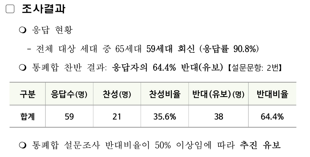 앞서 강남서초교육지원청은 2027년 3월 대청초를 폐교하고 영희초로 통합하는 통폐합 기본계획을 세우고 두 학교 학부모들을 대상으로 지난달 25일부터 28일까지 설문조사를 진행했다. 설문에는 대청초 1∼6학년 학부모 65명(세대당 1명만 참여) 중 59명이 참여했고, 38명(64.4%)은 반대(유보), 21명(35.6%)은 찬성 의견을 냈다. 강남서초교육지원청은 “대상자의 60% 응답, 응답자의 50% 이상 찬성시 통폐합을 추진하려했으나 반대 비율이 50% 이상이어서 통폐합 추진이 유보됐다”고 밝혔다.