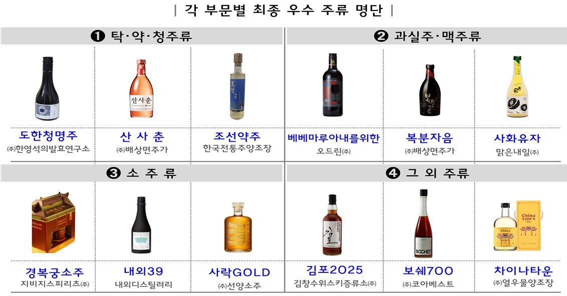 국세청에 따르면 각 부문별 3개, 총 12개가 수상작으로 선정됐다. 우선 탁·약·청주류에서 도한청명주·산사춘·조선약주가 선정됐고, 과실주·맥주류에서는 베베마루 아내를 위한·복분자음·사화유자가 뽑혔다. 소주류에서는 경복궁소주·내외39·사락GOLD, 그 외 주류 부문에서는 김포2025·보쉐700·차이나타운이 선정됐다.