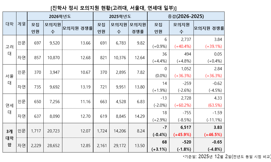 3일 진학사에 따르면 올해 정시 모의지원을 진행한 결과 서울대와 고려대, 연세대 모의지원 건수(예체능 제외)는 5만988건으로, 작년 동기(4만7393건)보다 7.6% 늘었다. 모의지원 데이터는 실제 지원 결과 예측 이전 단계에서 수험생 초기 관심도를 보여주는 지표로 활용할 수 있다.