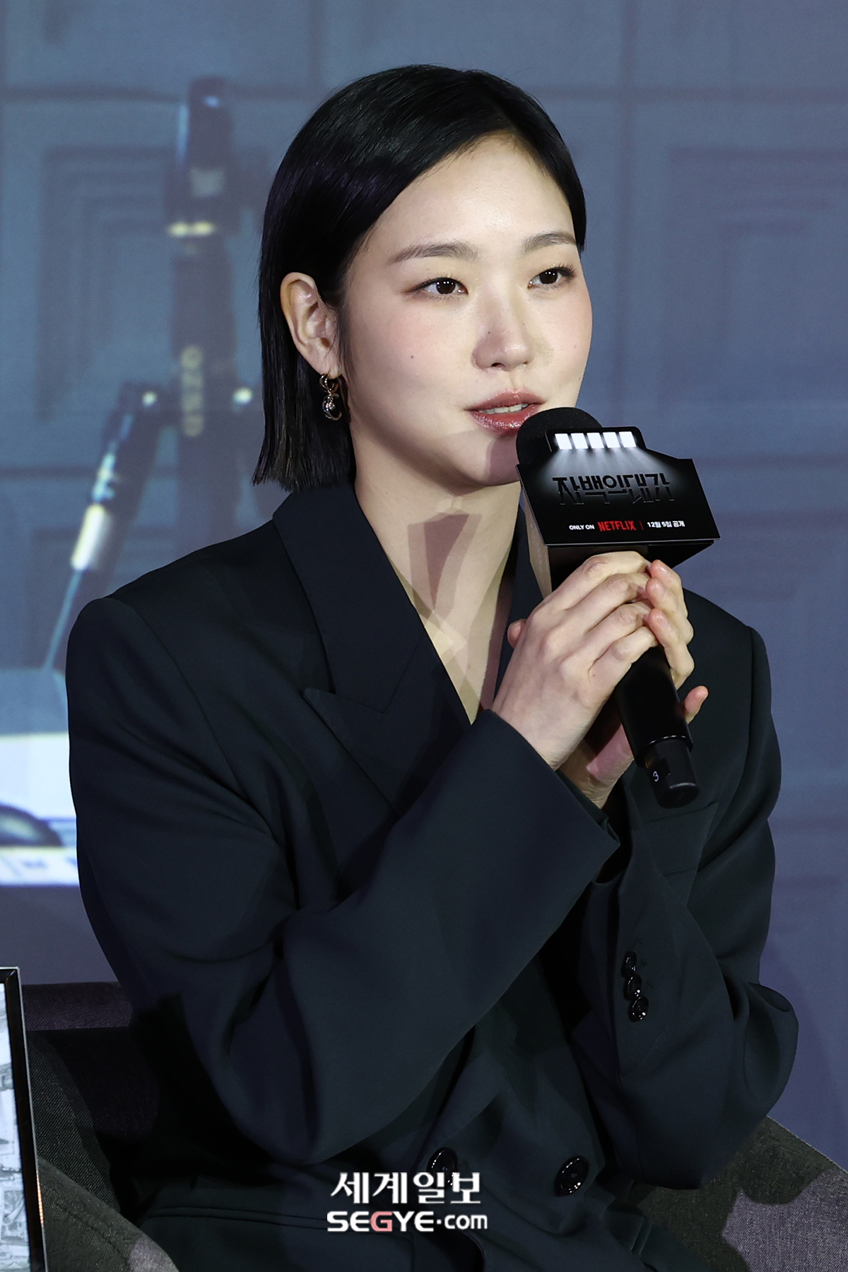 배우 김고은이 3일 용산 CGV에서 열린 넷플릭스 시리즈 ’자백의 대가’ 언론시사회에 참석해 인사말을 하고 있다.