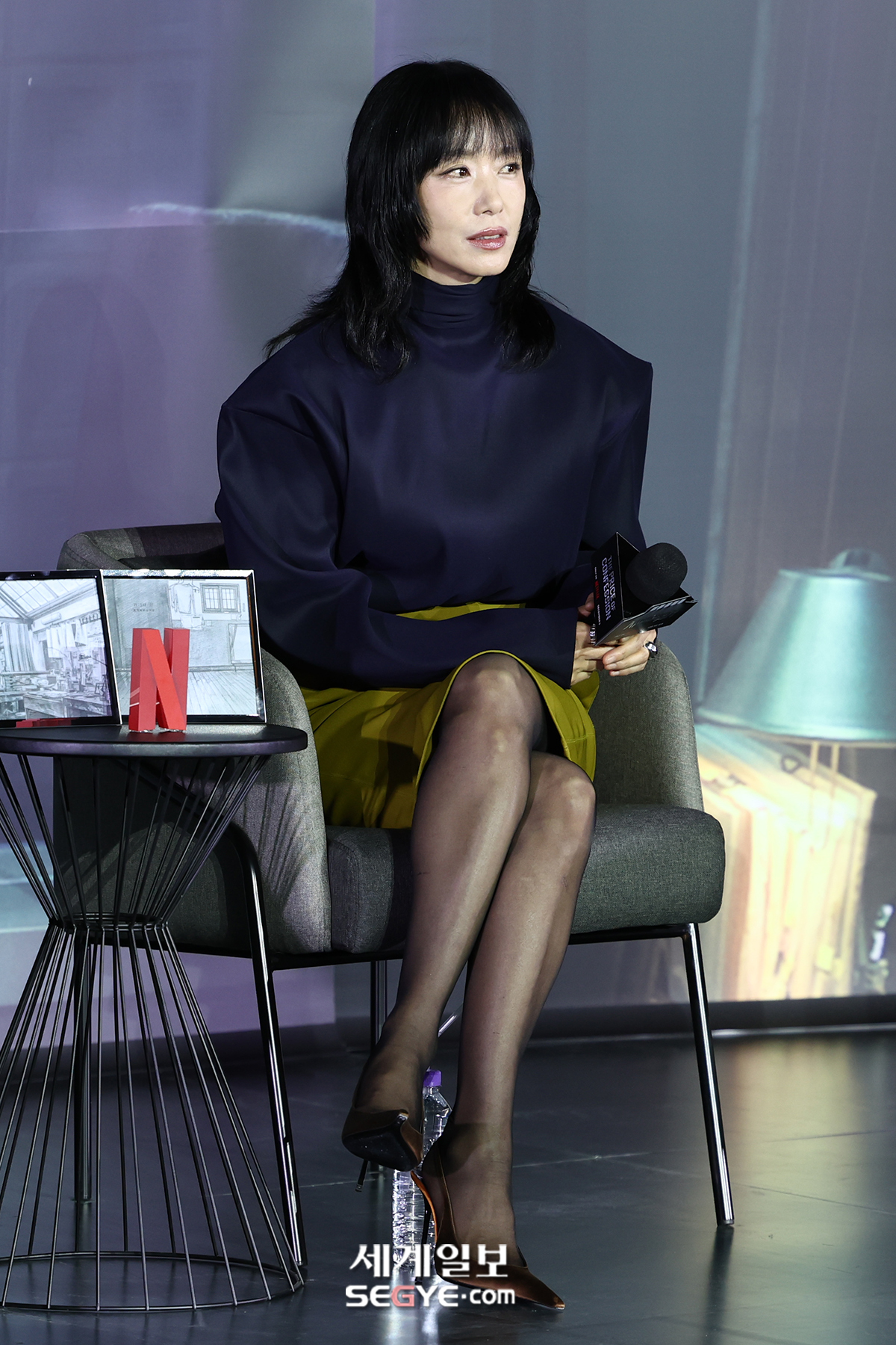 배우 전도연이 3일 용산 CGV에서 열린 넷플릭스 시리즈 ’자백의 대가’ 언론시사회에 참석해 취재진의 질문을 경청하고 있다.